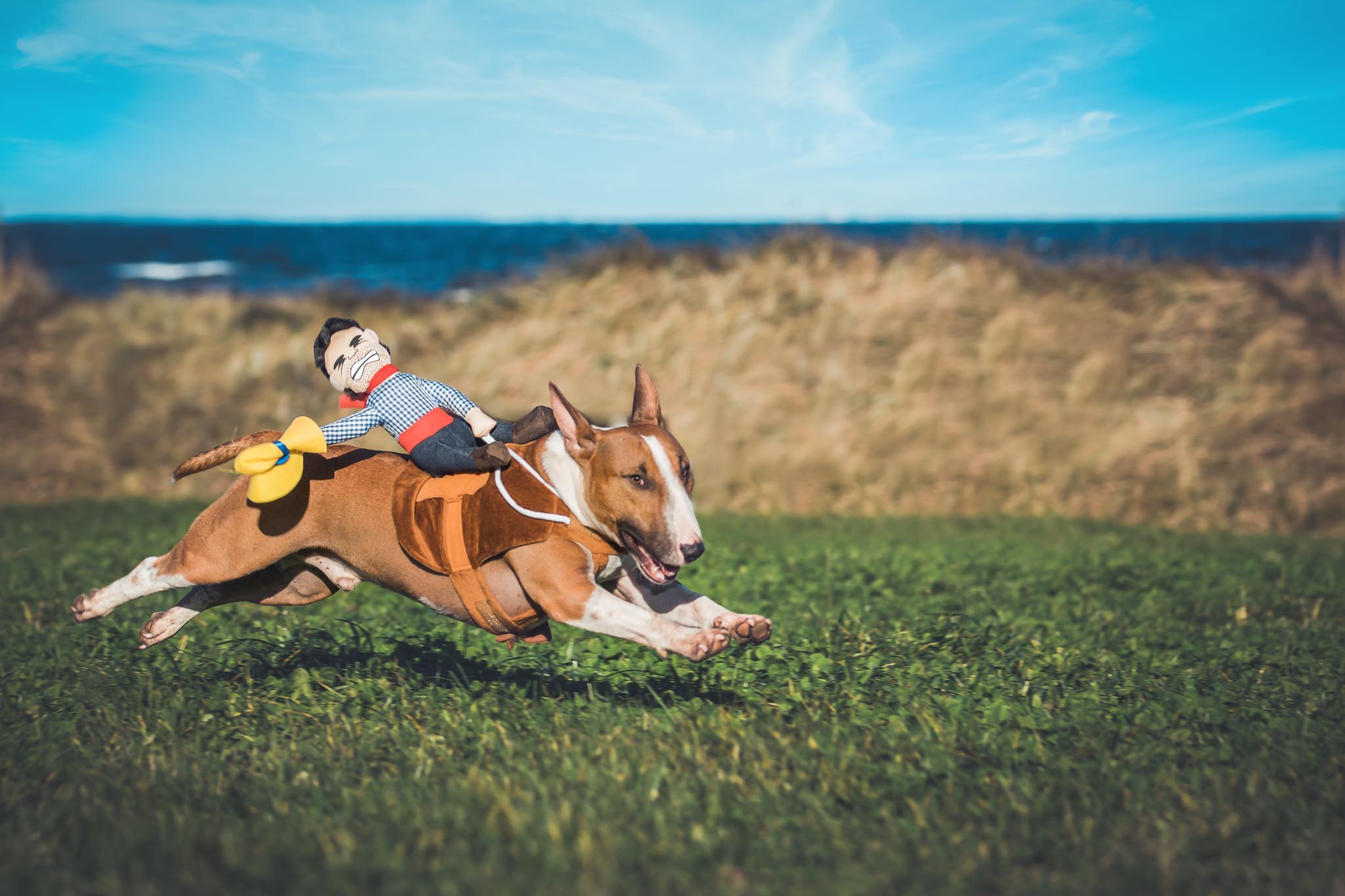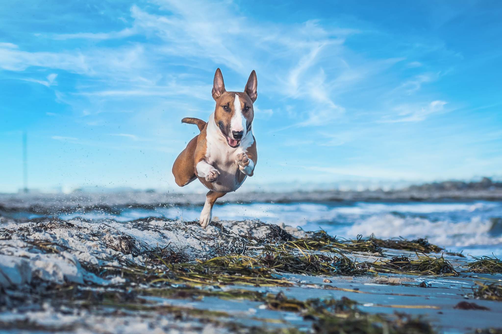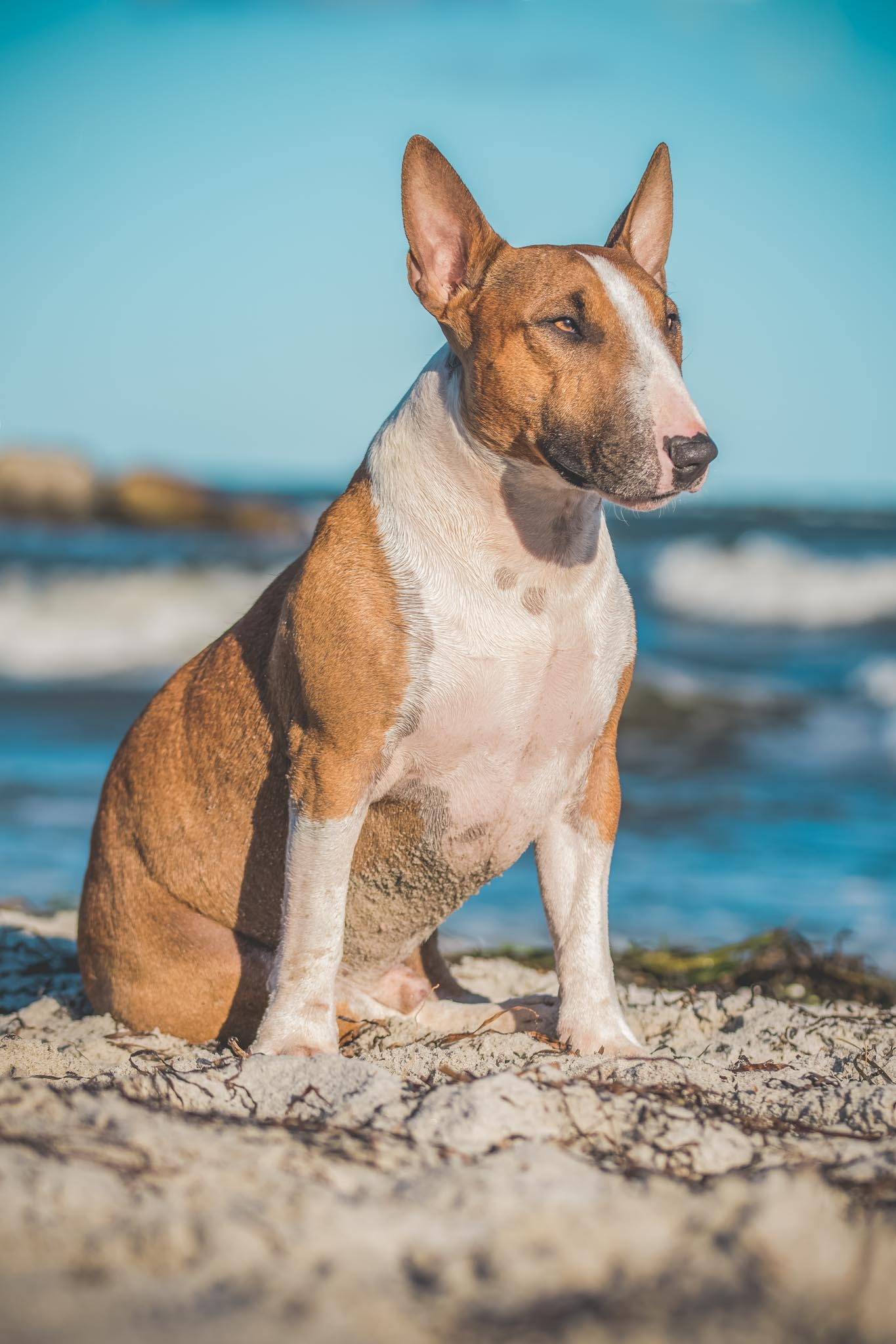 Clyde ist ein richtiger Bullterrier, einerseits mit viel Kirmes im Kopf, andererseits auch super lieb und gleichzeitig richtig agil. Clyde ist für unser Shooting quasi „geflogen“ und beide hatten total viel Spaß am Strand.