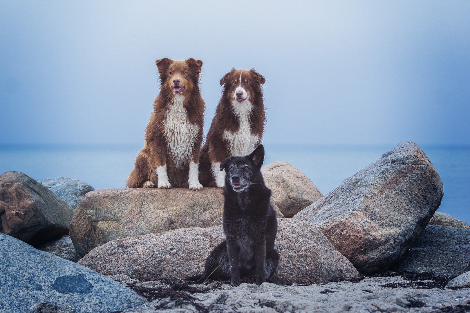 Ronja, Lilly und Sandy habe ich zusammen mit ihrem Frauchen kennen gelernt. Wir hatten einen trüben Tag im November, als wir uns am Strand von Laboe trafen. Die 3 Vierbeiner waren richtig lustig zusammen und meine Aufgabe war es, wirklich von allen schöne Fotos zu machen. Das war vor allem aus einem Grund eine Herausforderung: „Rentnerin“ Sally sollte zwischen den beiden Wirbelwinden Ronja und Lilly nicht untergehen!
