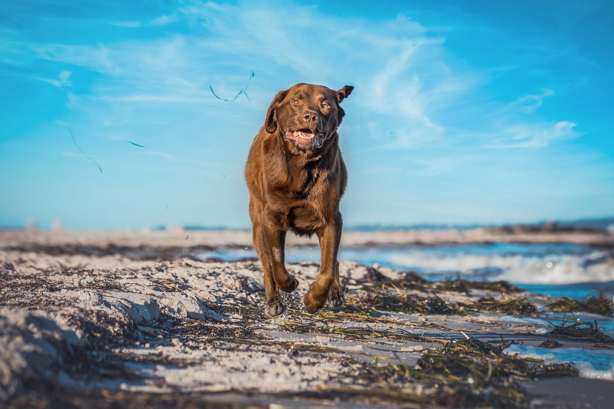 Clyde ist ein richtiger Bullterrier, einerseits mit viel Kirmes im Kopf, andererseits auch super lieb und gleichzeitig richtig agil. Clyde ist für unser Shooting quasi „geflogen“ und beide hatten total viel Spaß am Strand.